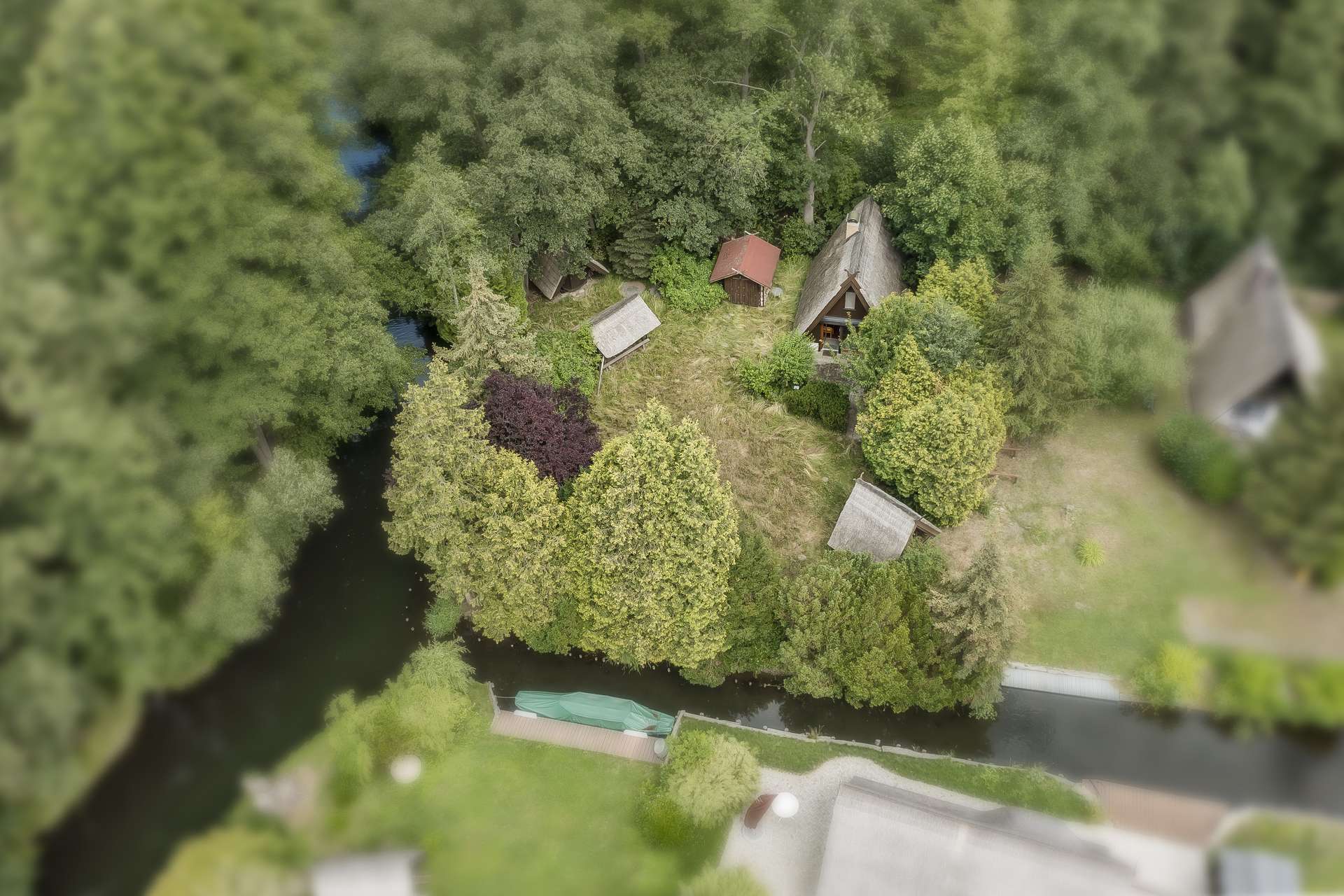 Reetgedecktes Ferienhaus im Spreewald auf großem Grundstück und ca. 2,55 Hektar unverbaubarem Land. Sehr ruhige Randlage an kleiner Ferienhaussiedlung mit direkter Wasserlage an einem Spreewald-Kanal. Vollausgestattet und -möbliert, inkl. Gartengeräten. Sofort bezugsfähig. Nur ca. 1 bis 1,5 h von Berlin und ca. 1,5 h von Dresden entfernt.